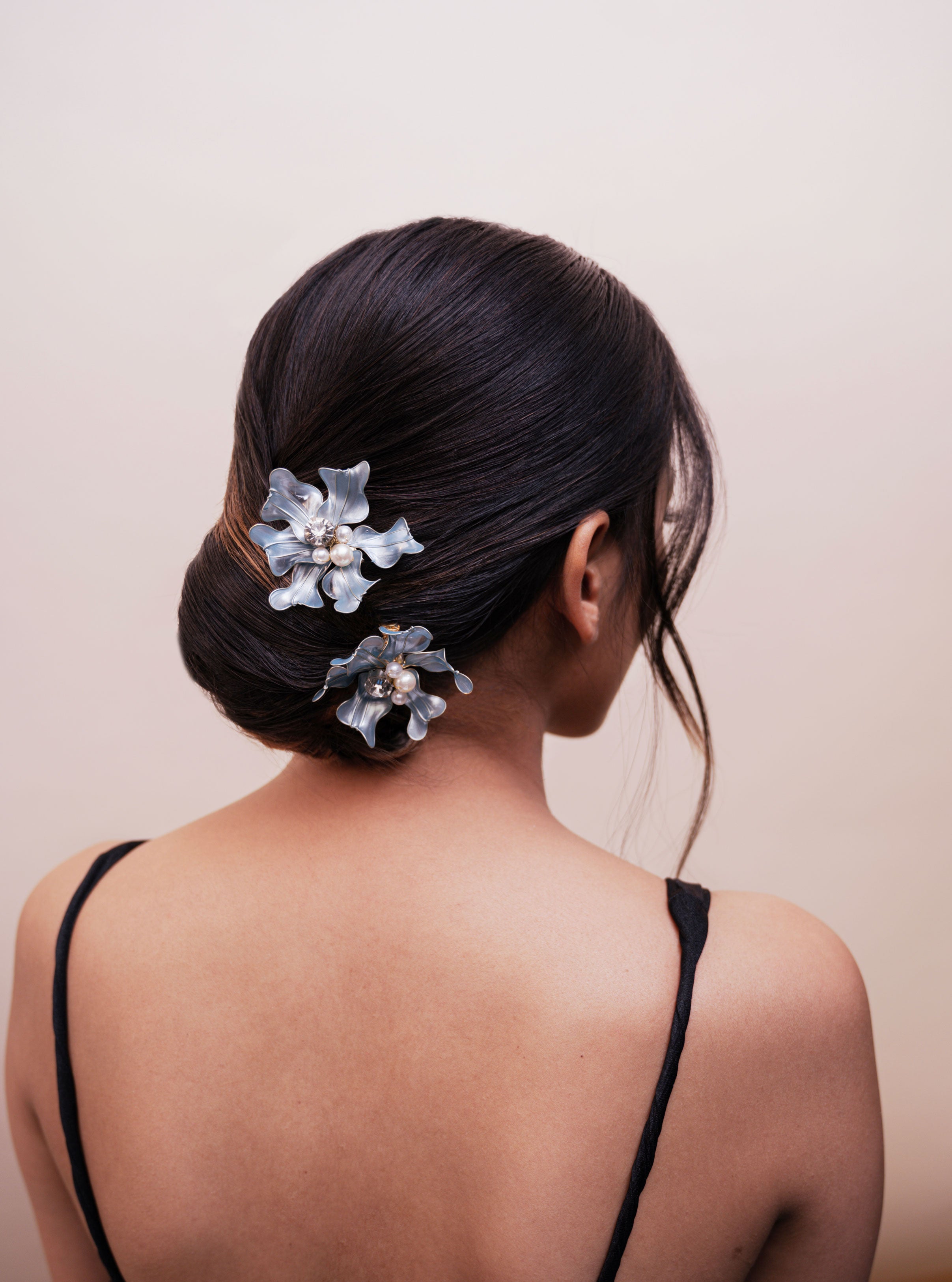 These fancy hair pins are a perfect blend of enamel flowers and metal charms, adding a touch of sophistication and elegance to your hairstyle. Each set is handmade with care, making each piece unique.