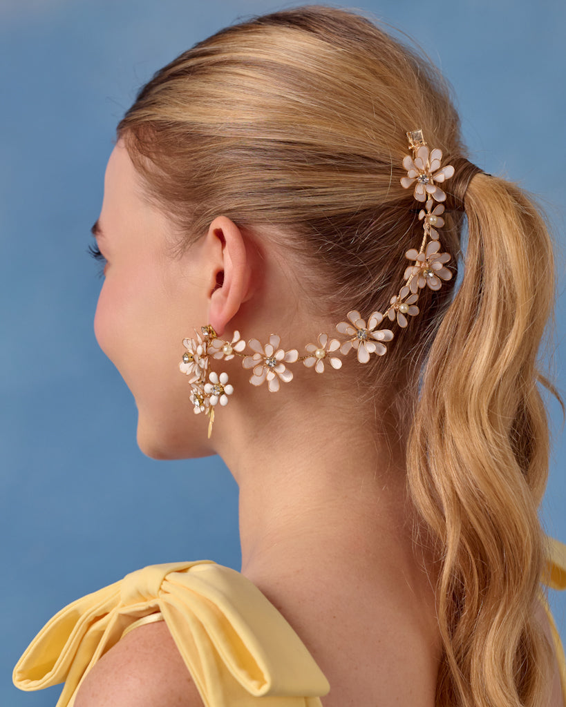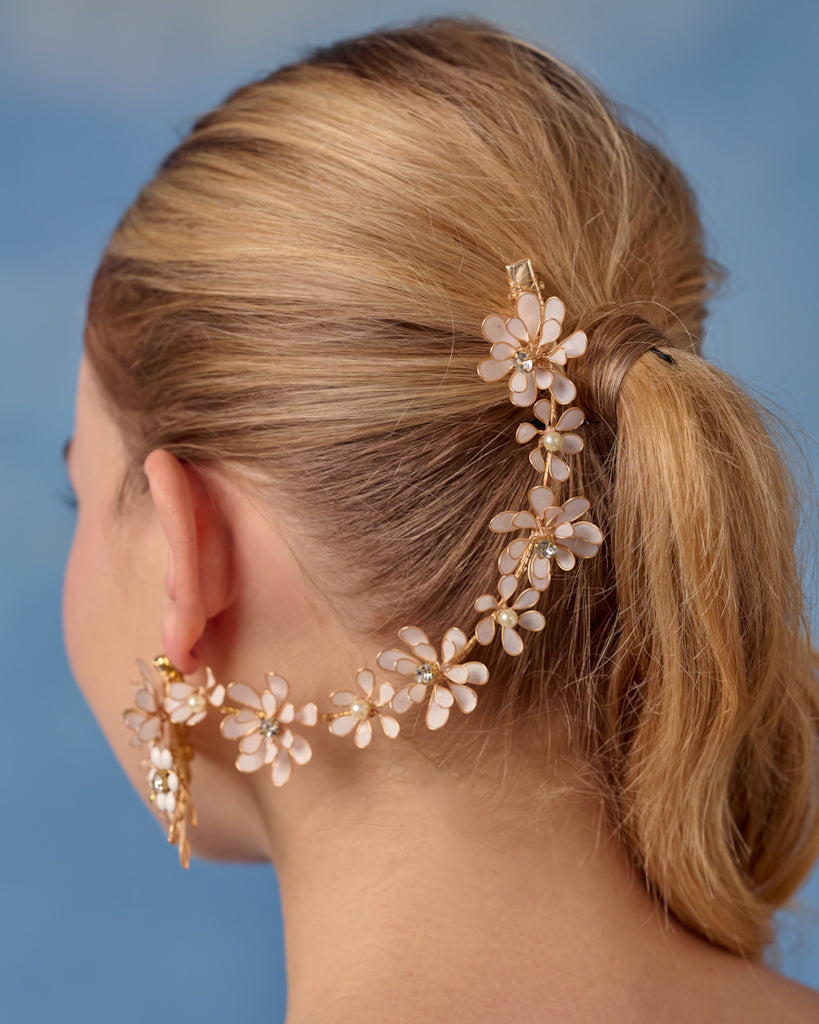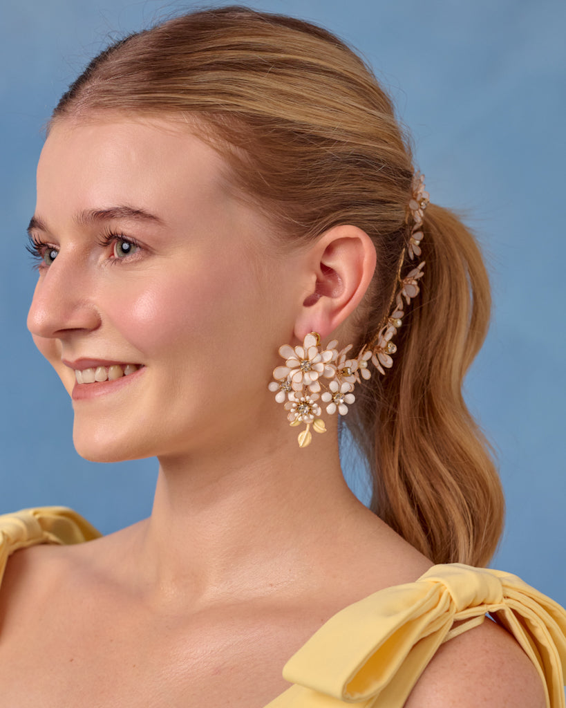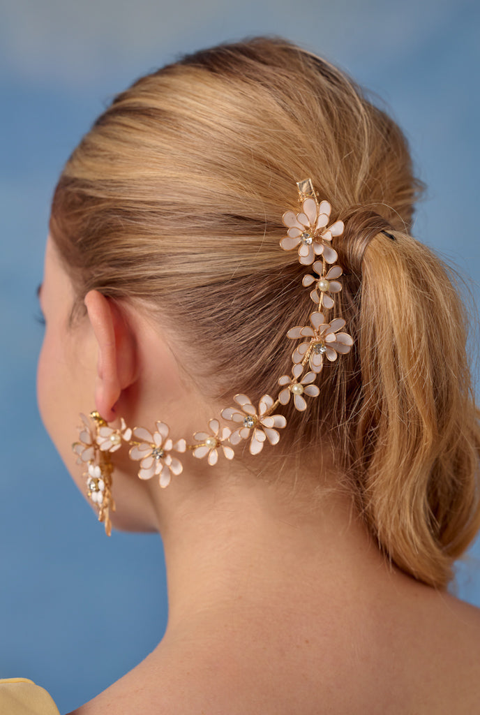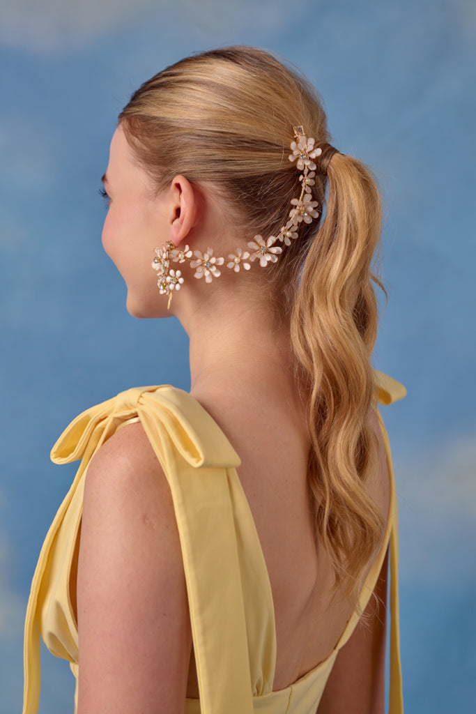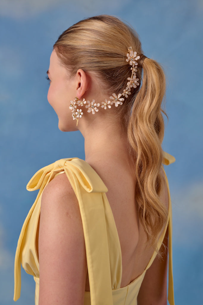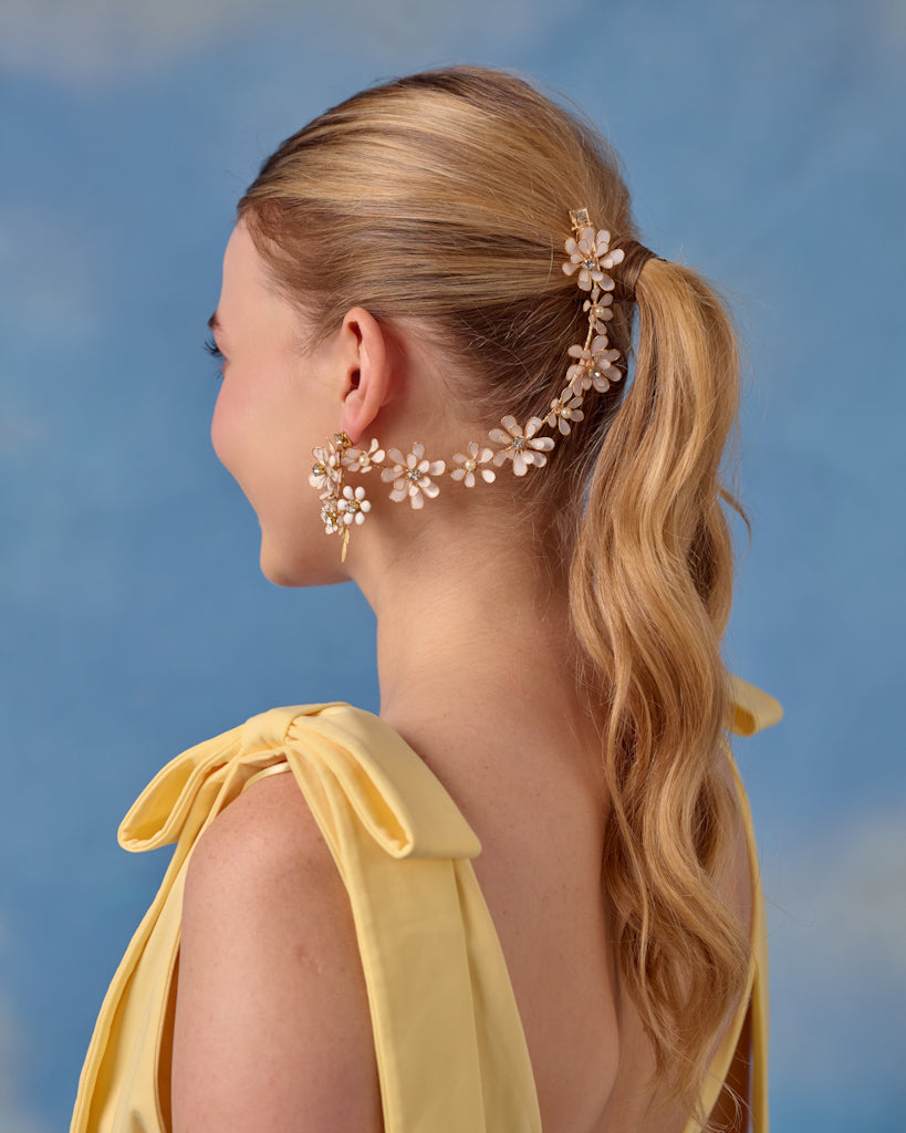 The Calla Kanchain drapes the ear with gentle, floral-inspired resin motifs linked by fine chains. Its fluid, airy design adds a dreamy softness to the bridal look while maintaining a sophisticated finish. A beautifully balanced piece that elevates traditional styling with a contemporary touch.