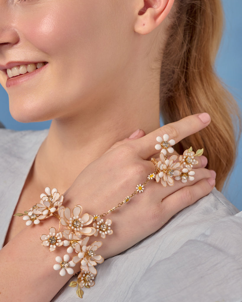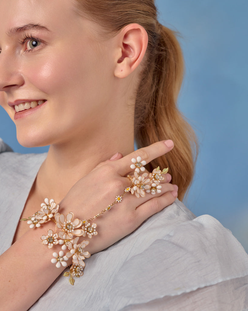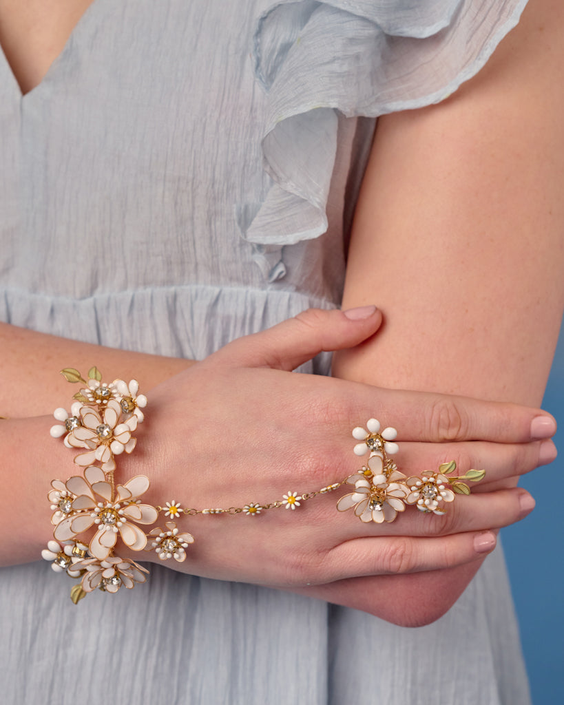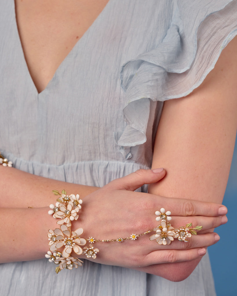 The Calla Hathphool adorns the hand with delicate resin florals connected through fine, elegant chains. Designed to move naturally with every gesture, it adds a pretty, romantic charm to mehendi moments, haldi ceremonies, and the wedding day itself. A sophisticated blend of tradition and contemporary beauty.