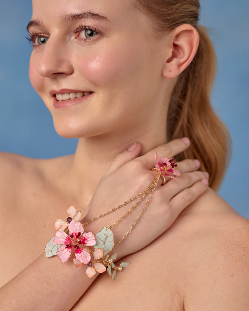 The Kabira Hathphool drapes the hand with a sequence of smooth resin elements connected by fine, fluid chains. Its design highlights structure and movement, creating a polished, modern aesthetic. Light, sculptural, and refined, it enhances every gesture with professional elegance and quiet allure.