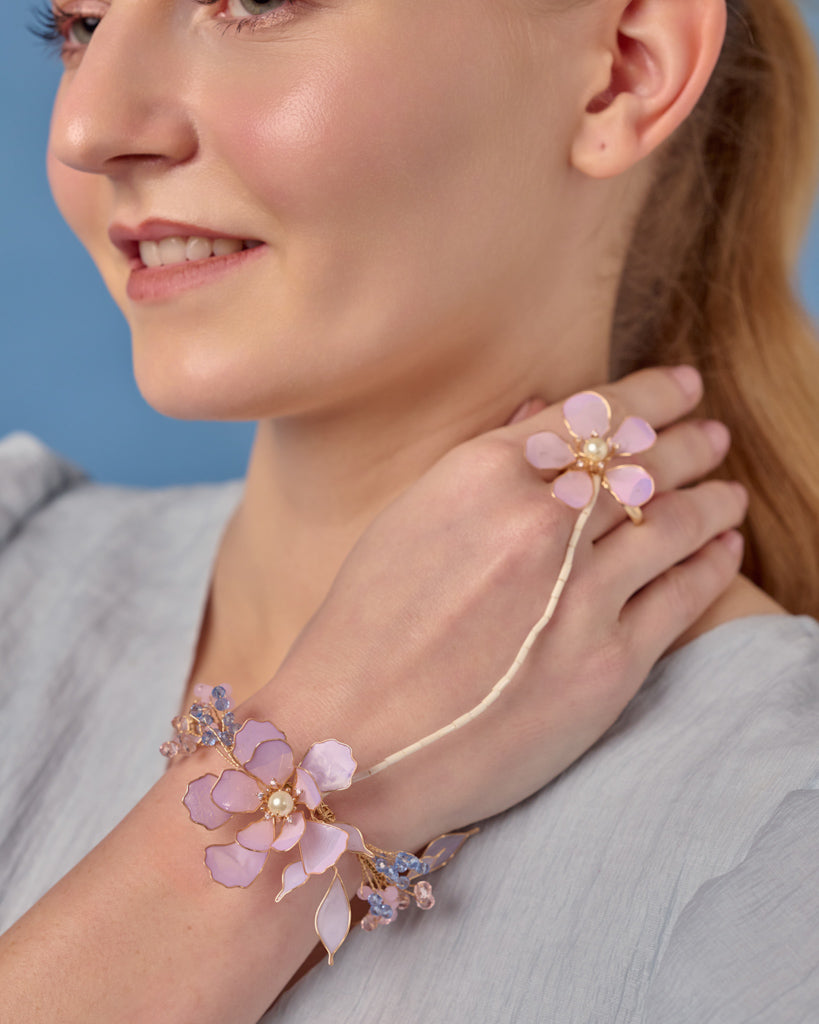 The Odelia Hathphool adorns the hand with delicate resin florals linked by fine, fluid chains that move with every gesture. Lightweight yet striking, it brings a romantic charm to bridal rituals and photography. For the bride who seeks sophistication in the smallest details, Lysa is the perfect finishing touch.