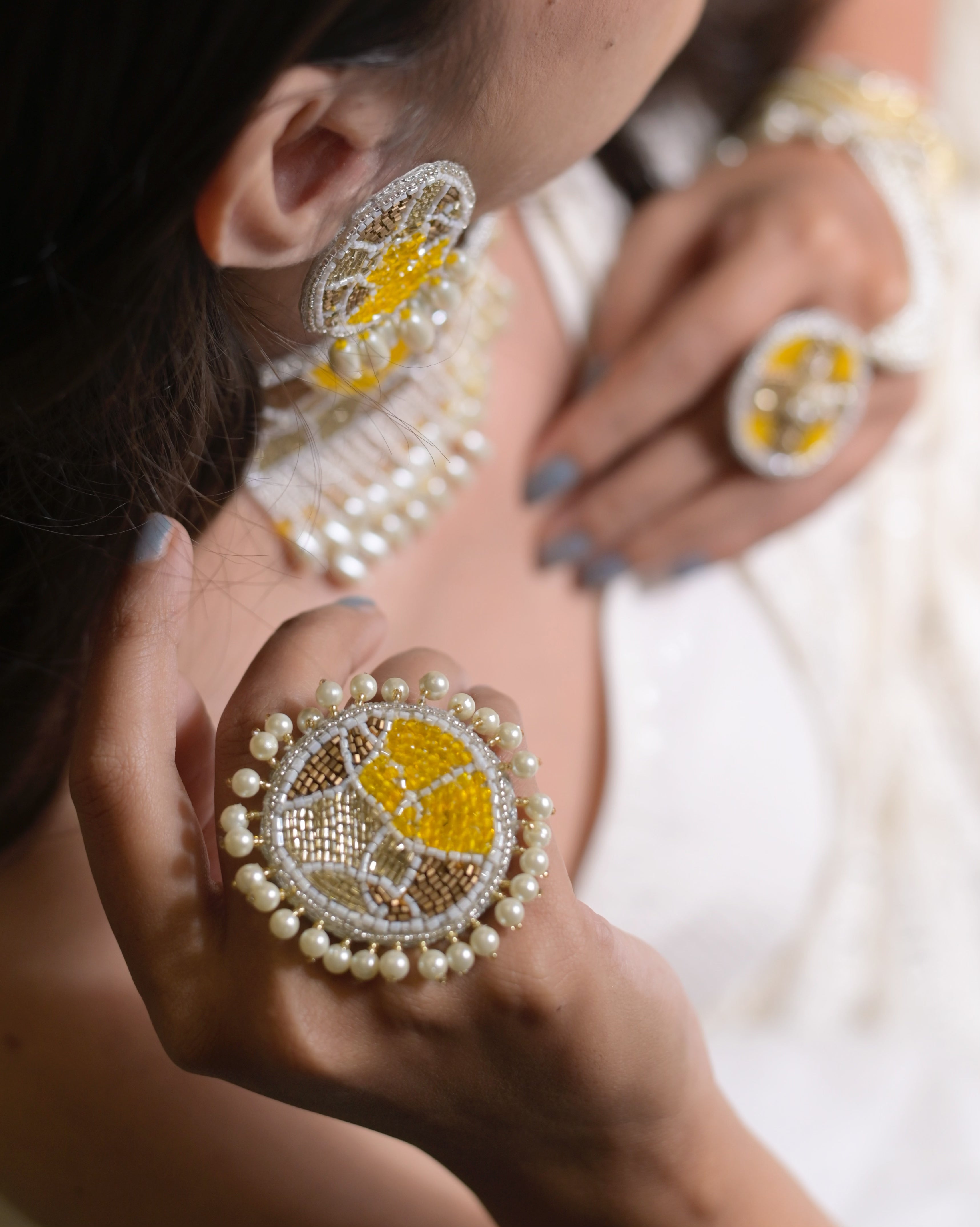 Description -Meticulously crafted, each ring tells a story of refined artistry and the delicate fusion of tradition with contemporary allure. The lustrous pearls, cradled within the artful embroidery, create a visual masterpiece on your fingers.
