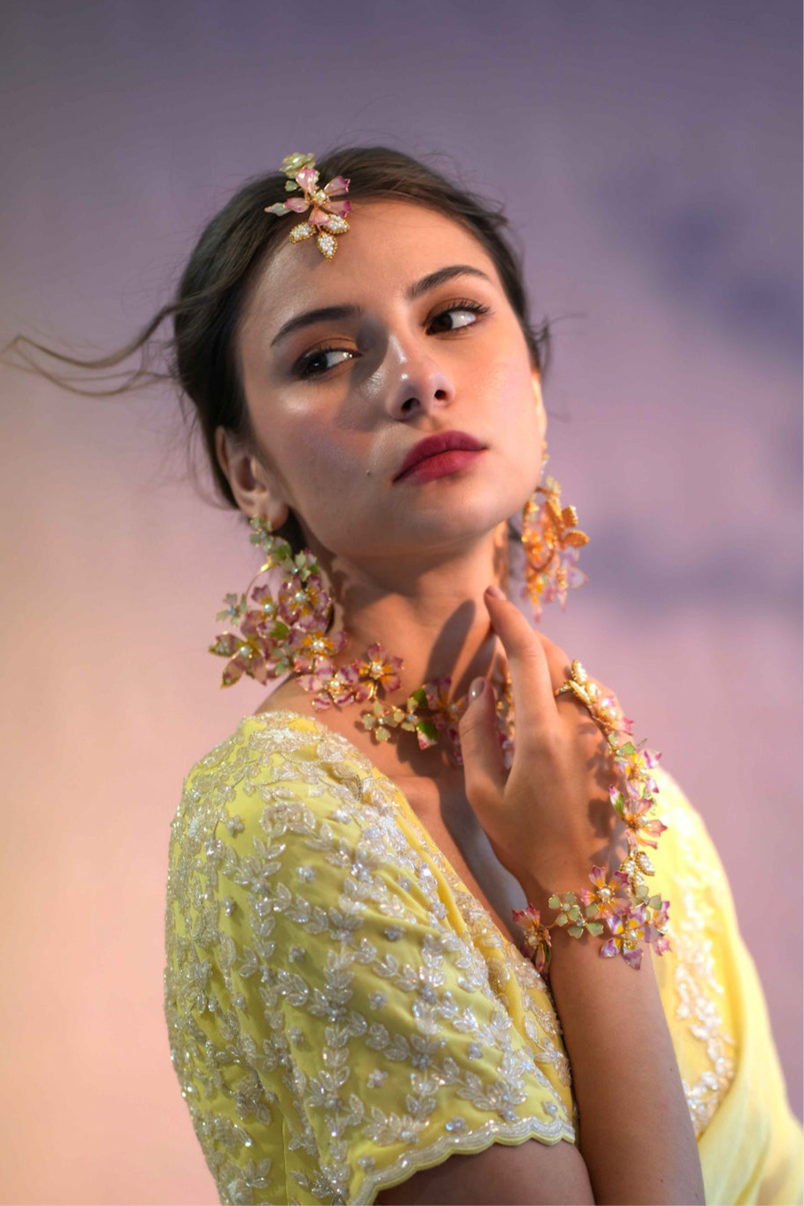 - Set includes:Necklace,maangtika,Haathphool pair and Earrings
