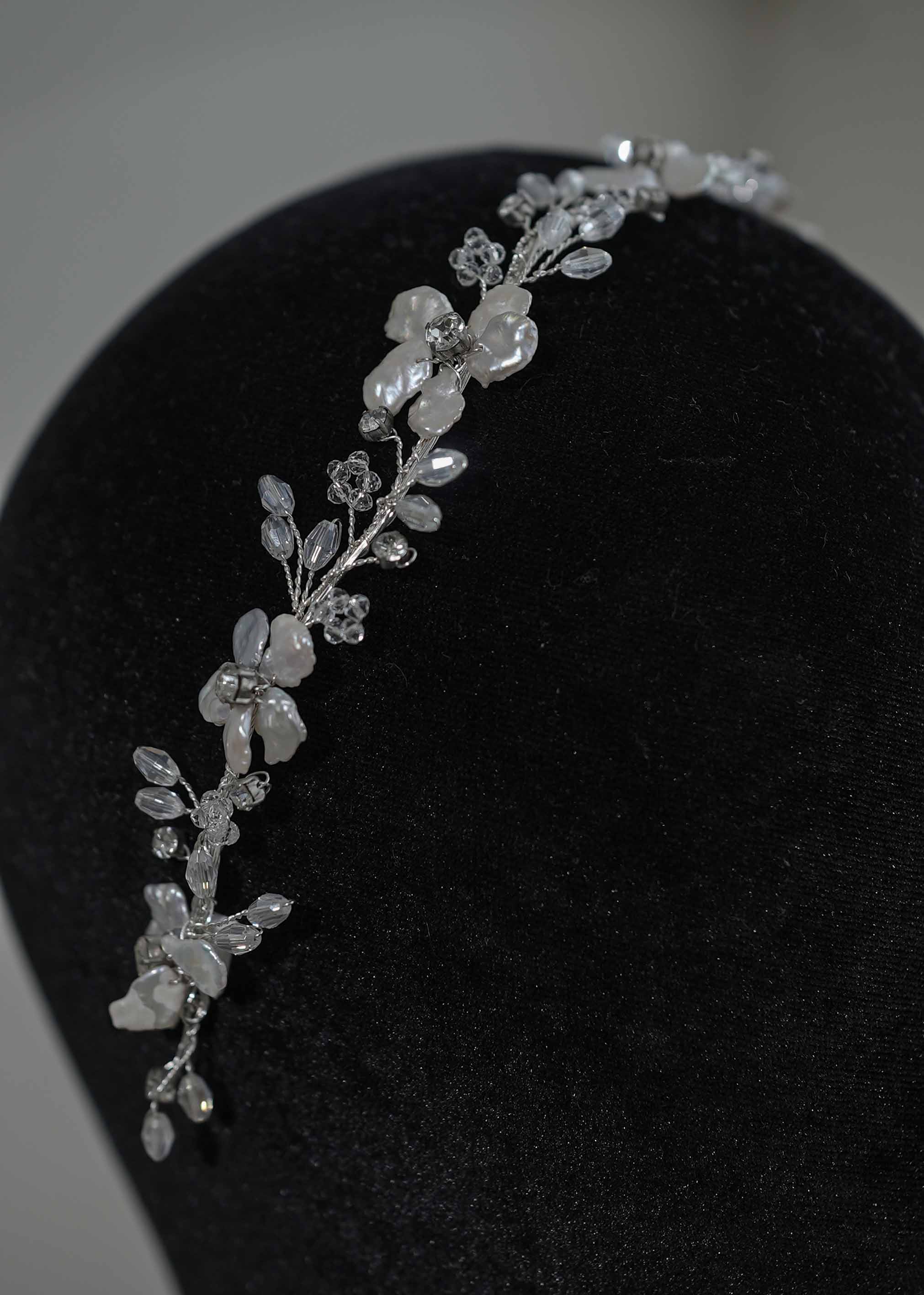 Looking to exude grace as you step into your special day? Choose Adele, a harmonious fusion of freshwater pearls, luminous glass tones, and glistening crystals, delicately handcrafted with tarnish-proof wire.