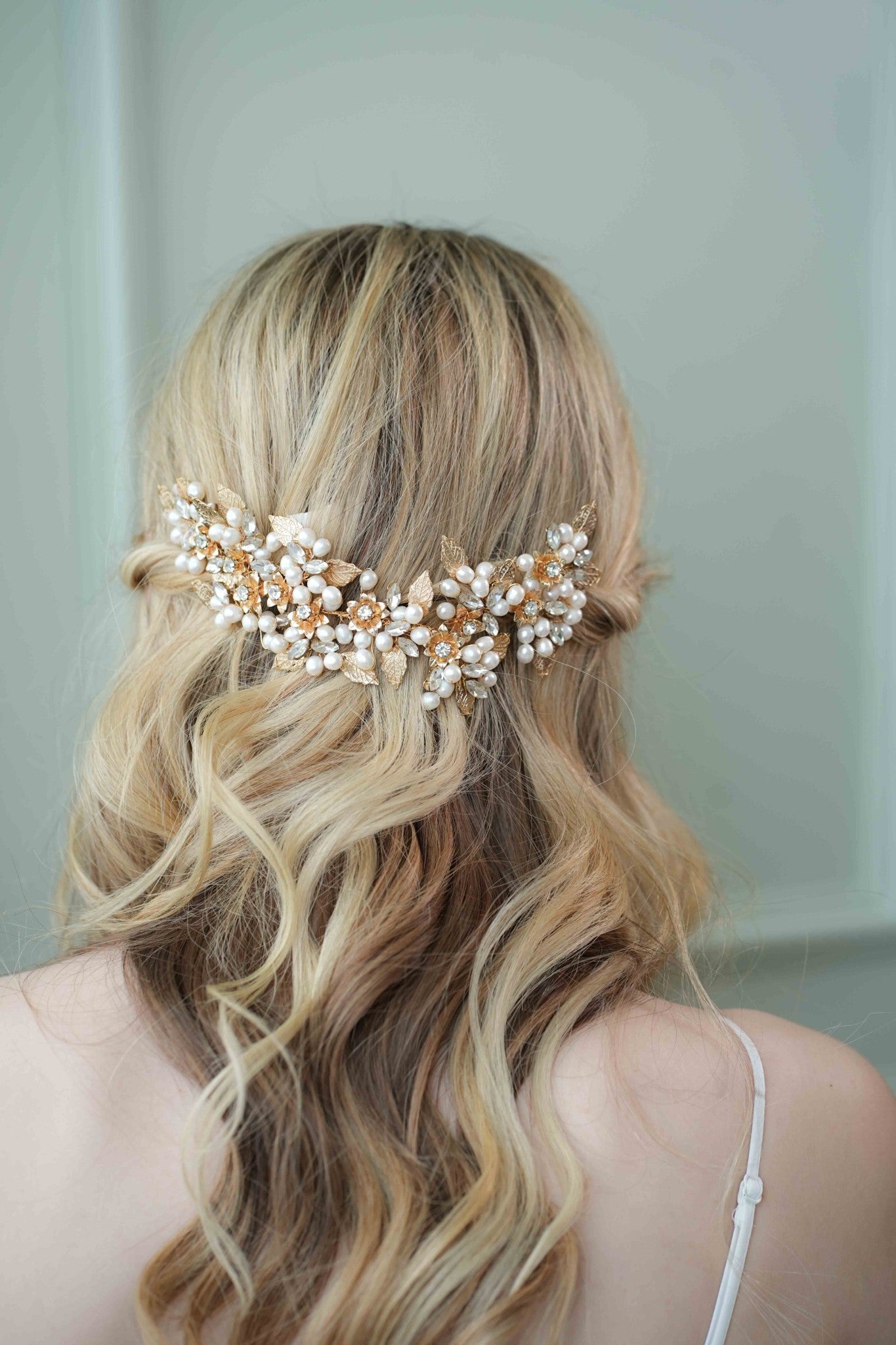 Material: Fresh water pearls,glass stone,metal leaf and flower