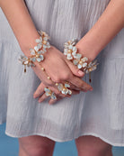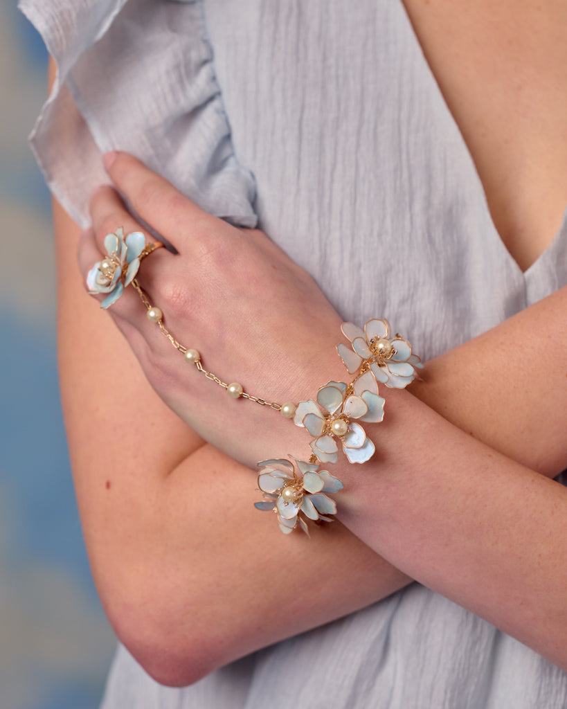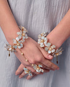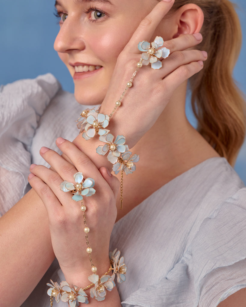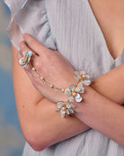 The Mariel Hathphool adorns the hand with an arrangement of resin blossoms linked by fine, elegant chains. Its movement is fluid and poetic, adding a romantic touch to every gesture — whether during rituals or captured moments. Light, intricate, and beautifully balanced, it brings a graceful delicacy to the bridal ensemble.