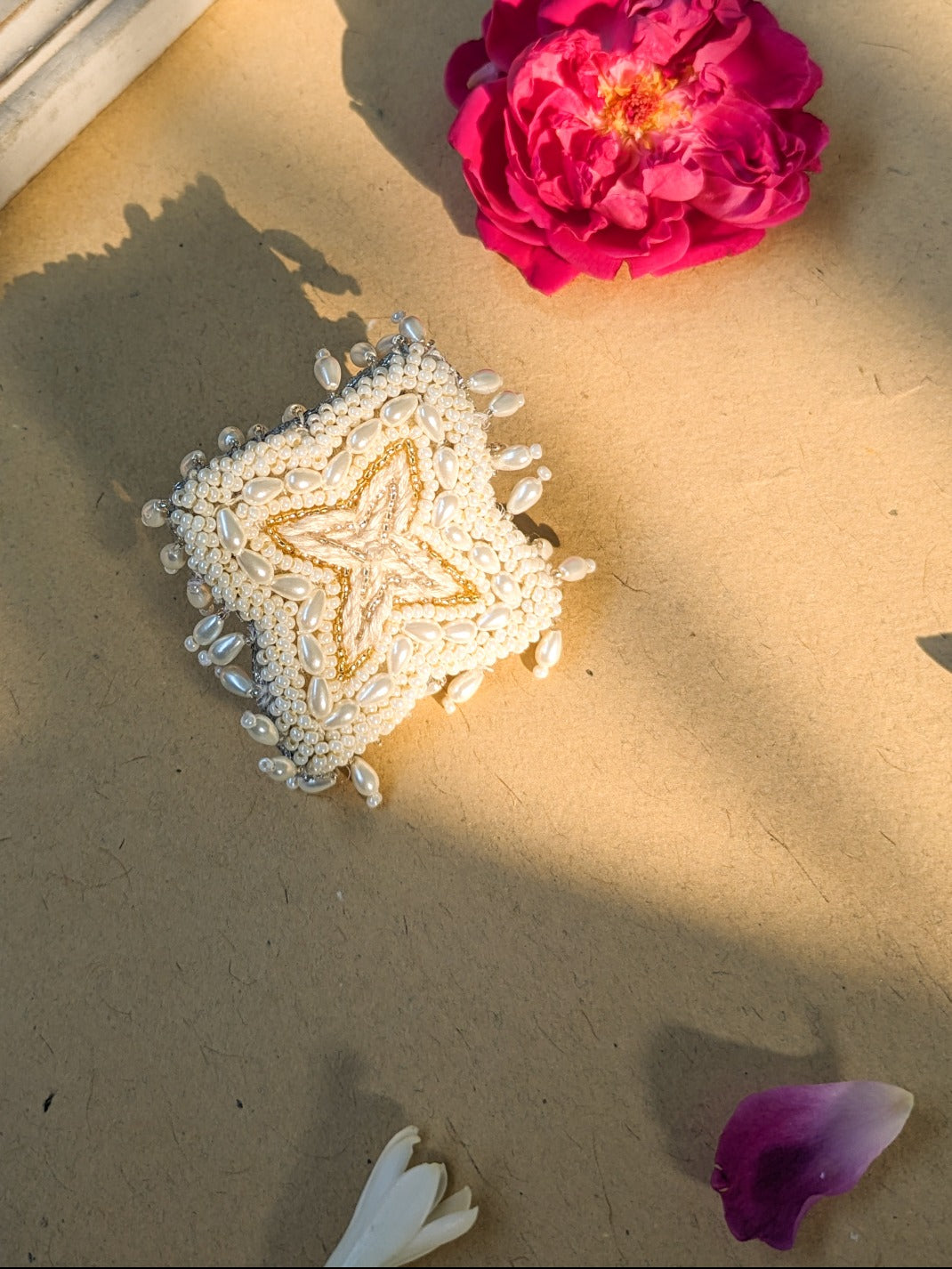 Description -Embrace the allure of white pearls and the intricate detailing of embroidery, celebrating the union of tradition and modern refinement in this captivating accessory.