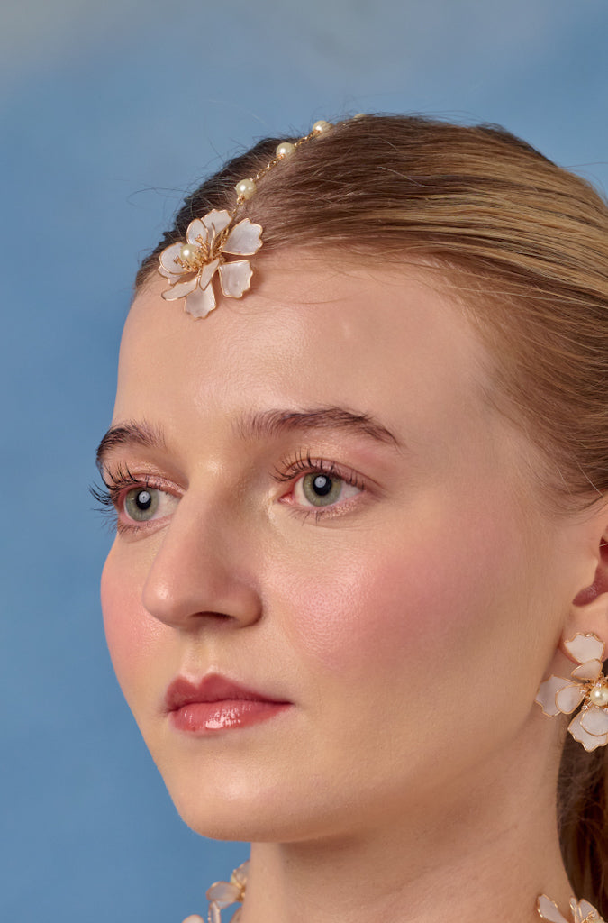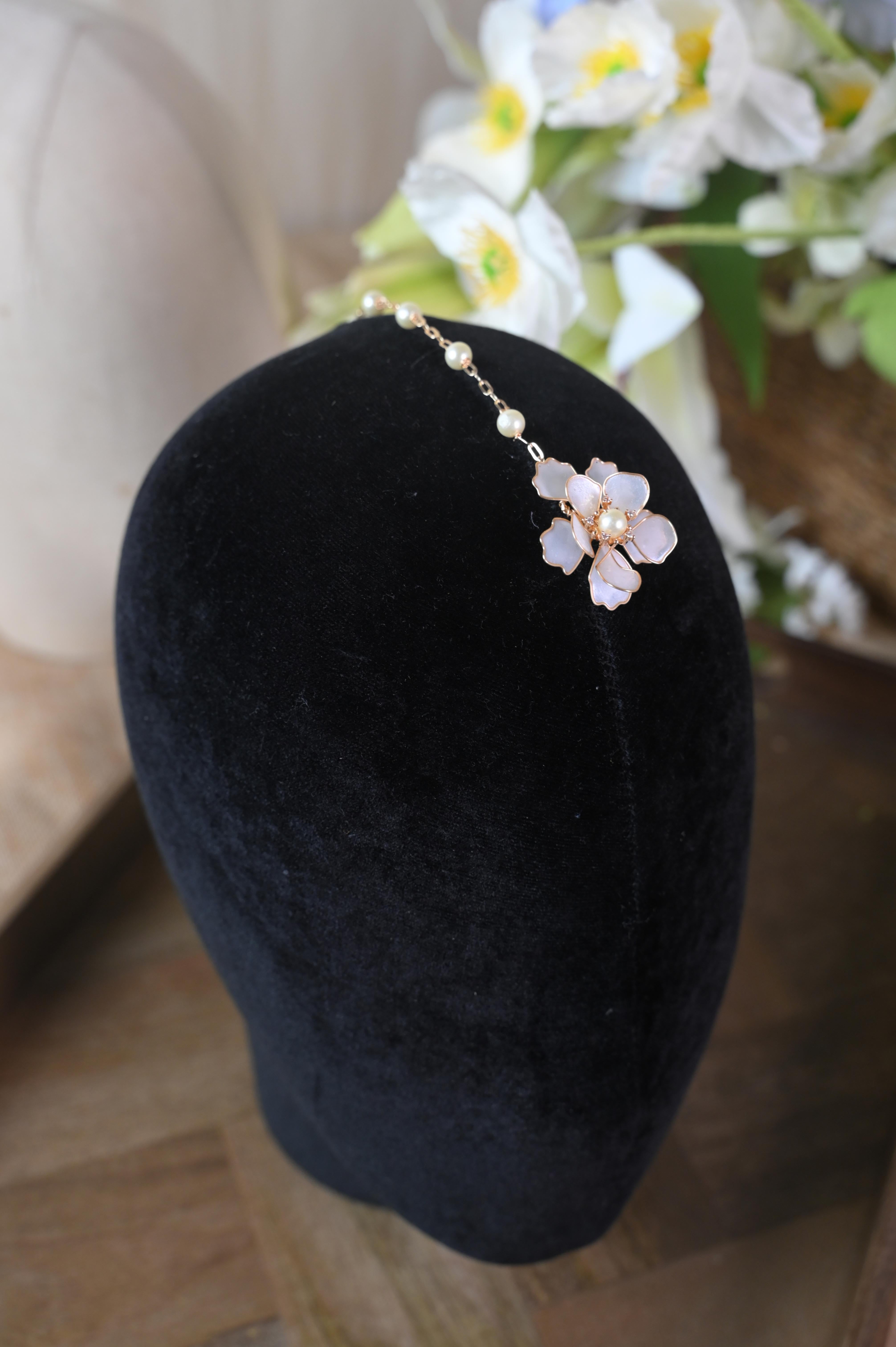 The Lumi Maangtika brings a touch of celestial elegance to the bridal ensemble. A shining resin centrepiece rests gracefully on the forehead, radiating a soft, polished gleam. Its clean lines and lightweight feel make it ideal for the bride who loves quiet luxury with modern charm.