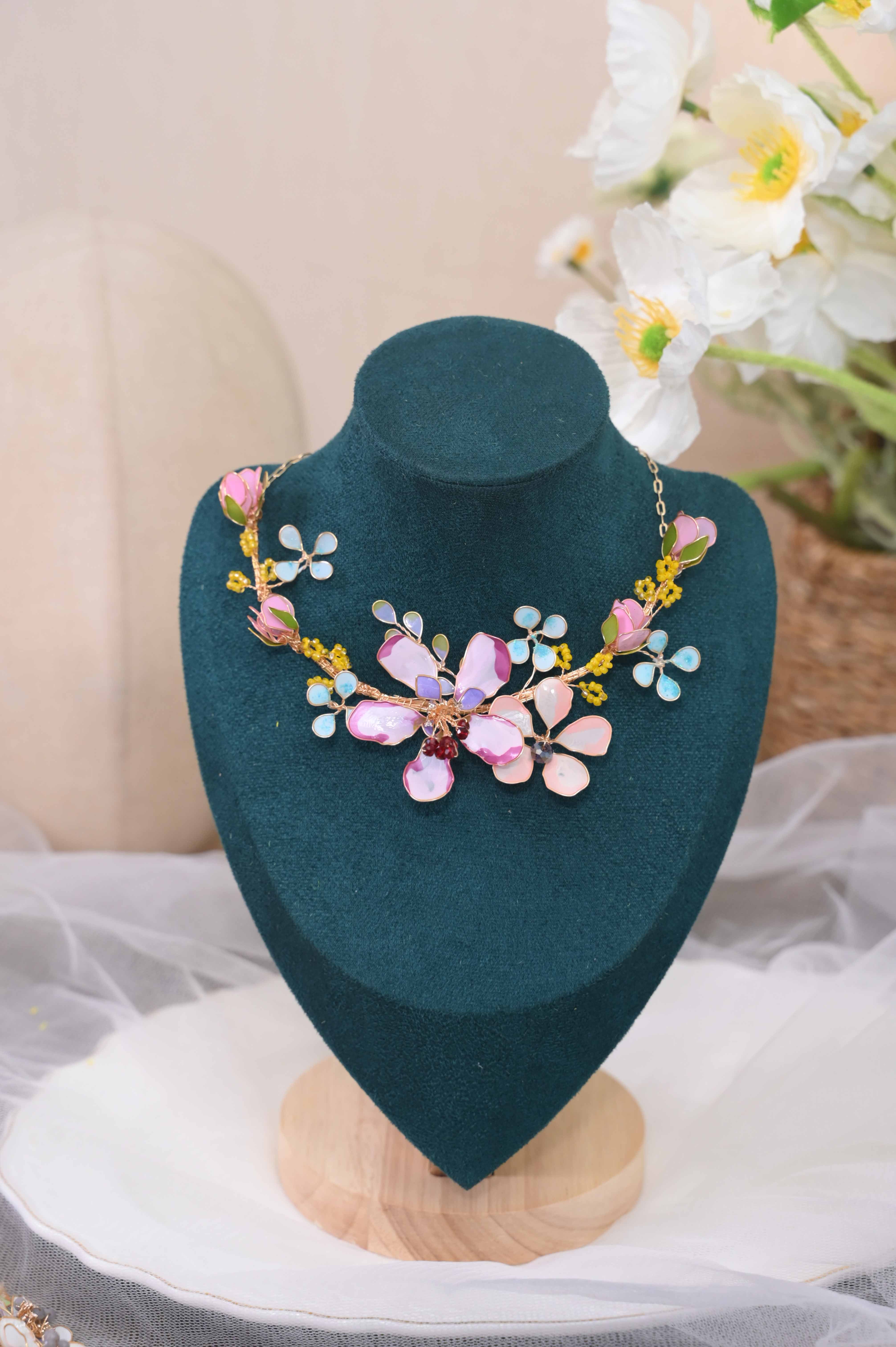 The Lysa Necklace glides along the neckline with a graceful arrangement of handcrafted resin elements. Each piece is shaped for a smooth, radiant finish that captures light beautifully. Modern, delicate, and timeless, it serves as a serene centrepiece for the bridal ensemble — a statement that feels both subtle and unforgettable.