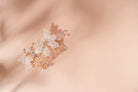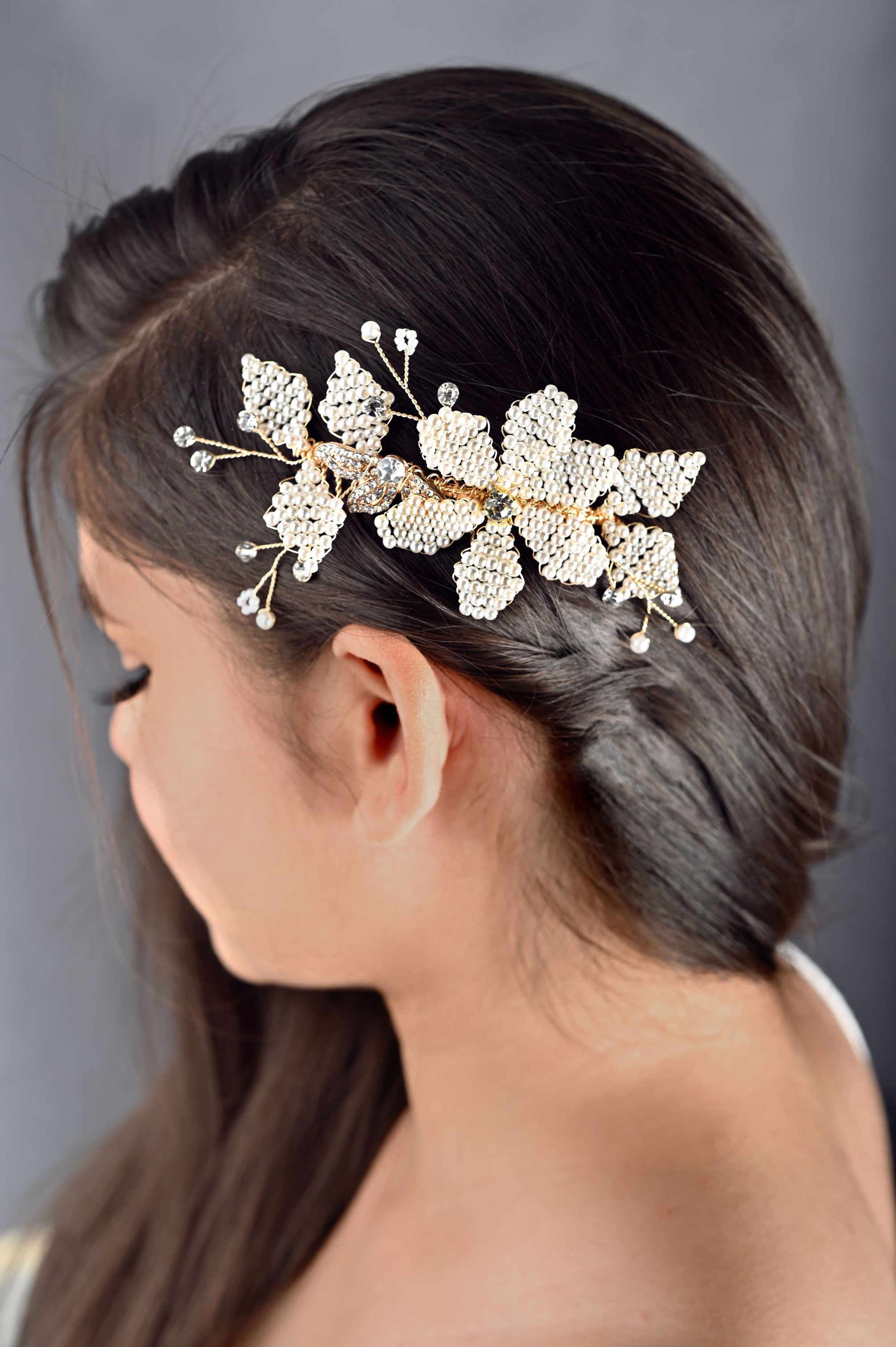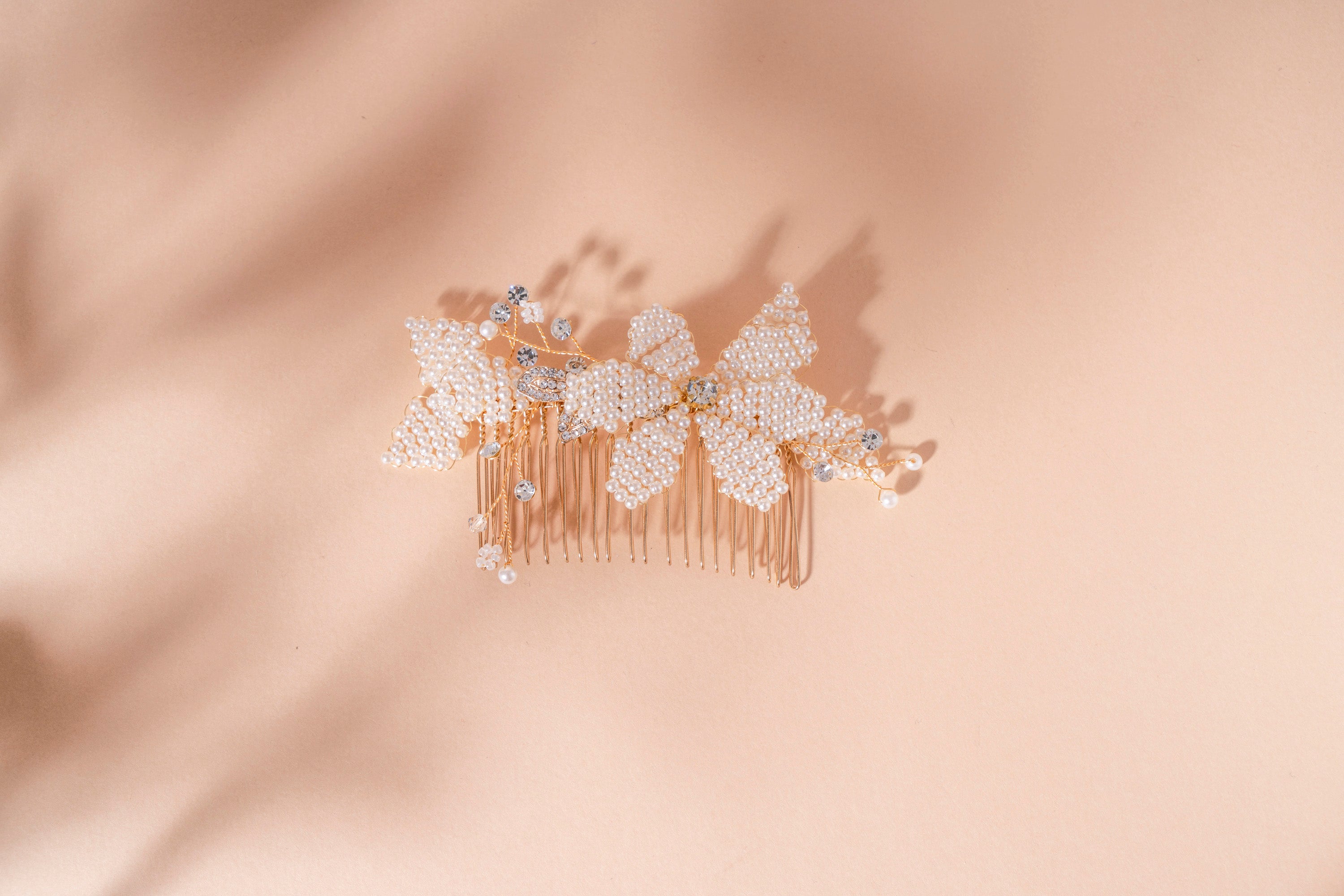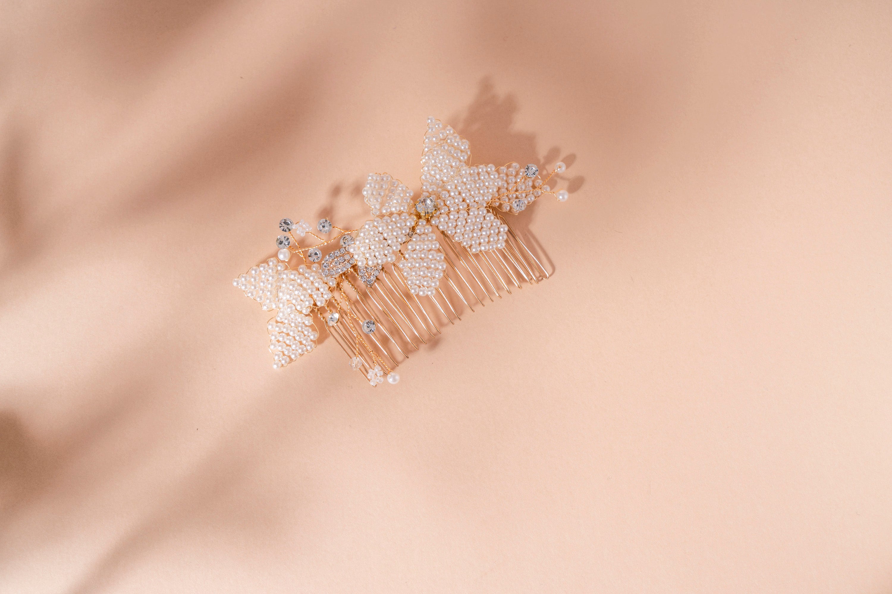 Pearls, crystal, metal charm, tarnish proof wire, comb, glass stone