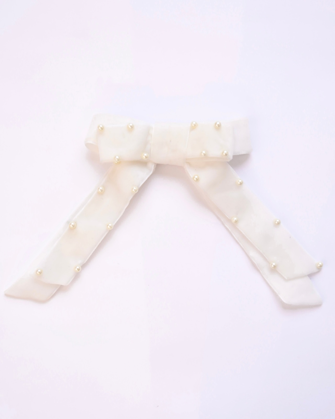 Ivy features a luxurious white velvet pearl bow, adding an elegant touch to any look. With its soft texture and timeless design, this accessory is perfect for adding a touch of sophistication to your outfit. Upgrade your style with Ivy.