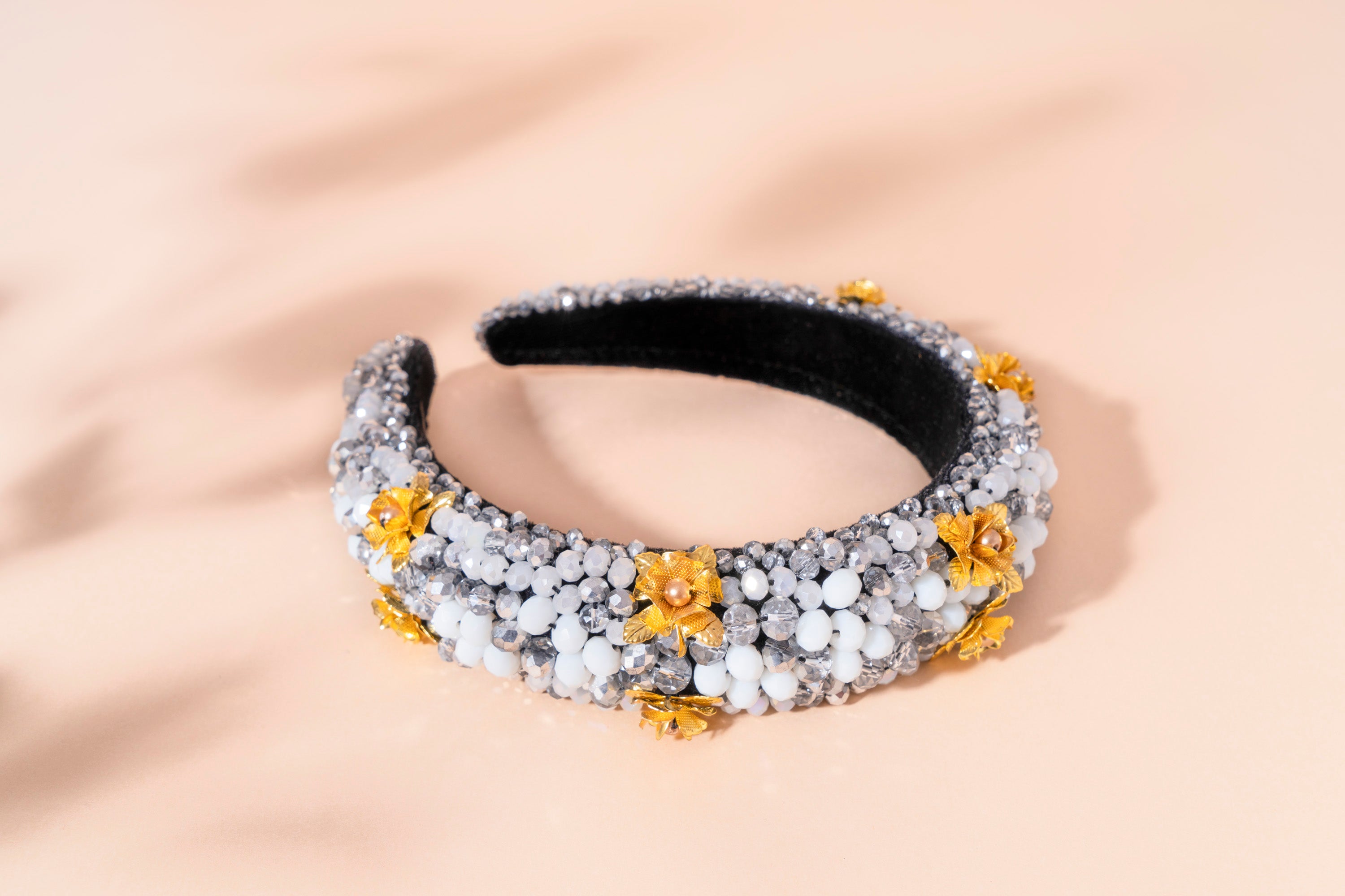 Crystals, metal flowers, velvet plastic base
