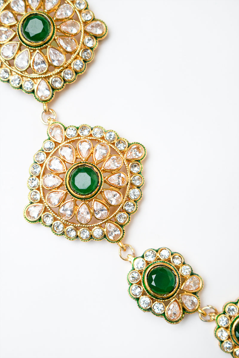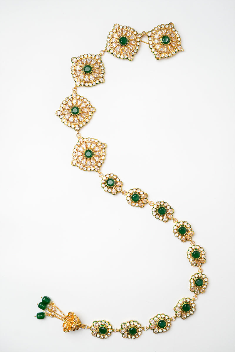 Intricately woven braid choti from gold-plated metal and adorned with glistening zircon stones, creating a celestial symphony that captures the essence of stardust.
