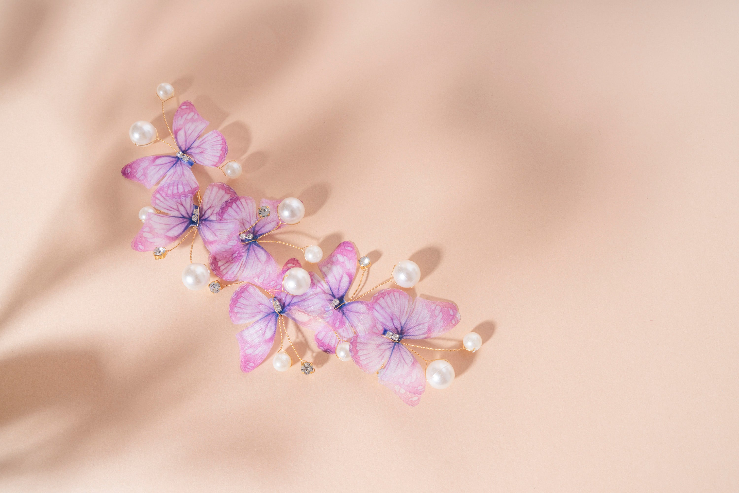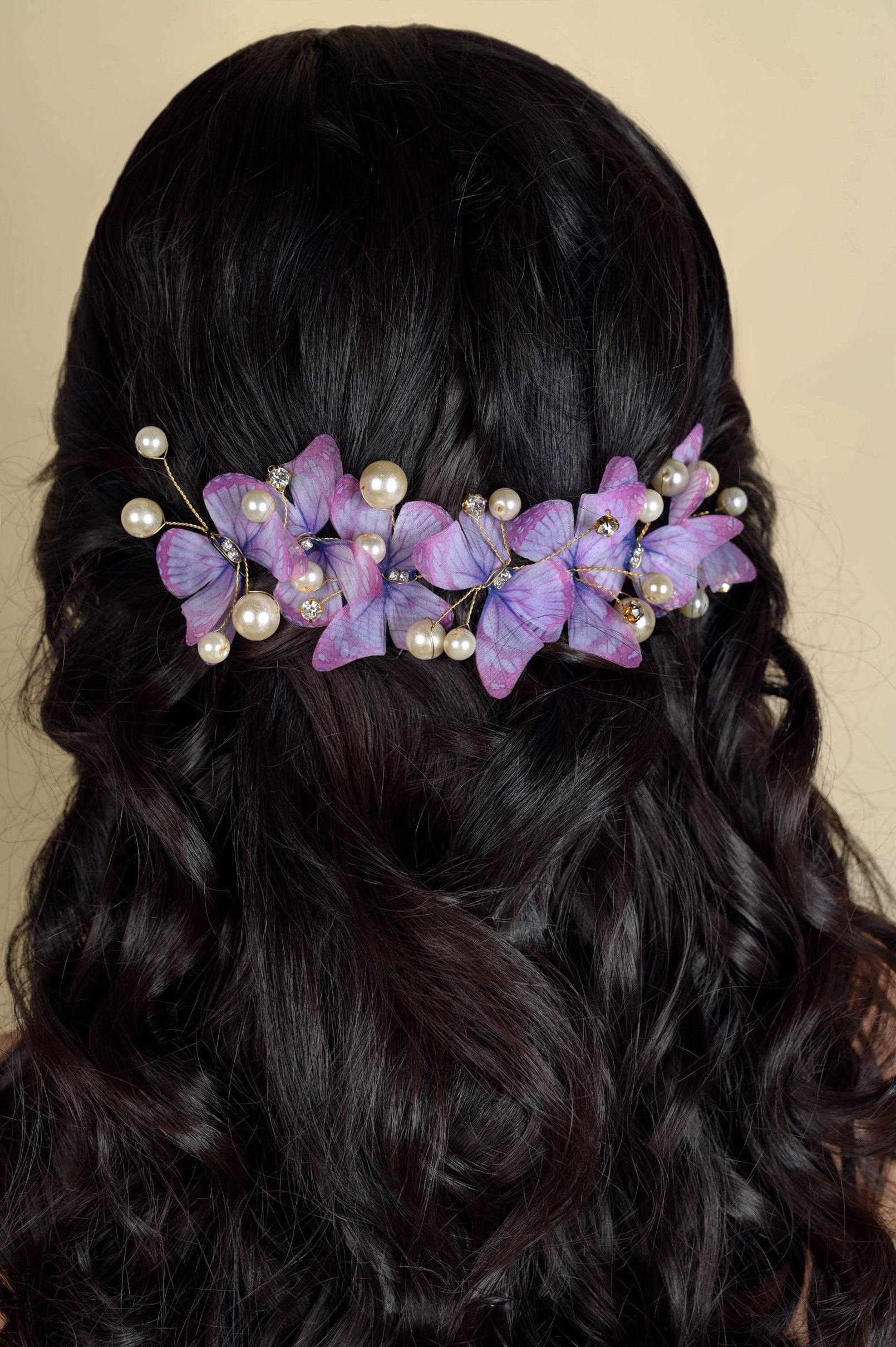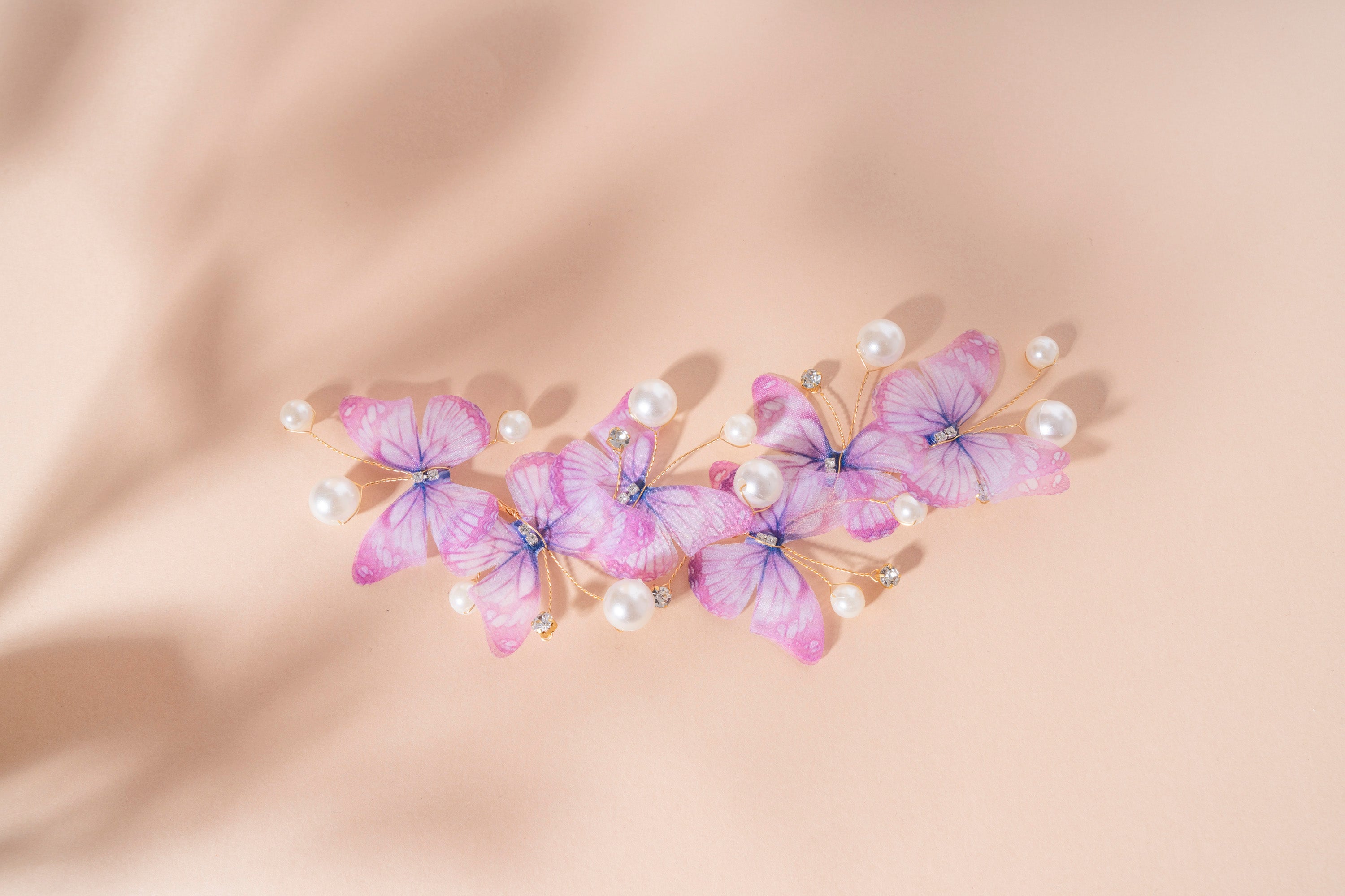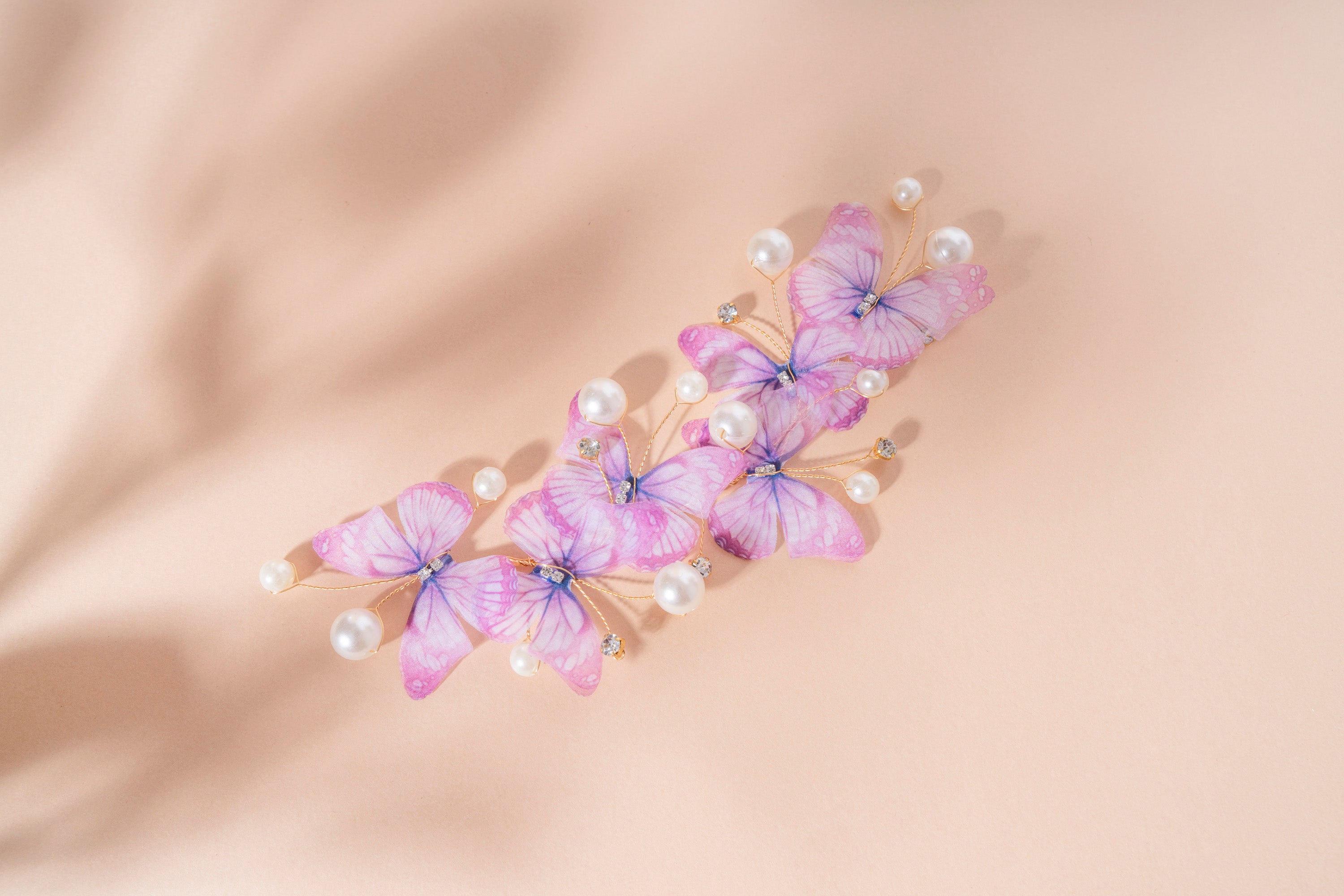 An elegant butterfly brooch features silk butterflies, expertly crafted and designed to look like they're in flight. The butterflies are embellished with delicate glass pearls that add an extra layer of elegance to the brooch. This butterfly brooch is perfect for events such as baby showers, haldi ceremonies, and wedding receptions, adding a touch of glamour to any outfit.