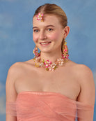 The Junia Bridal Set brings together the earrings, necklace, maangtika, and hathphool into one beautifully curated ensemble. Crafted in premium resin with soft floral inspiration, each piece complements the next to create a look that is harmonious, elegant, and effortlessly sophisticated. For brides who adore minimal glamour with delicate detailing, the Junia Set is a perfect choice.