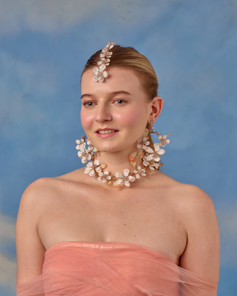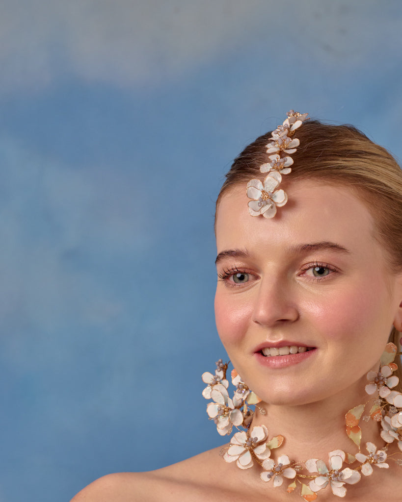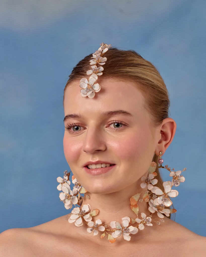 The Avia Set unites the earrings, necklace, maangtika, and hathphool into one cohesive, luminous ensemble. Soft floral curves, premium resin craftsmanship, and a serene modern aesthetic make this set a perfect expression of elegant, understated bridal luxury.