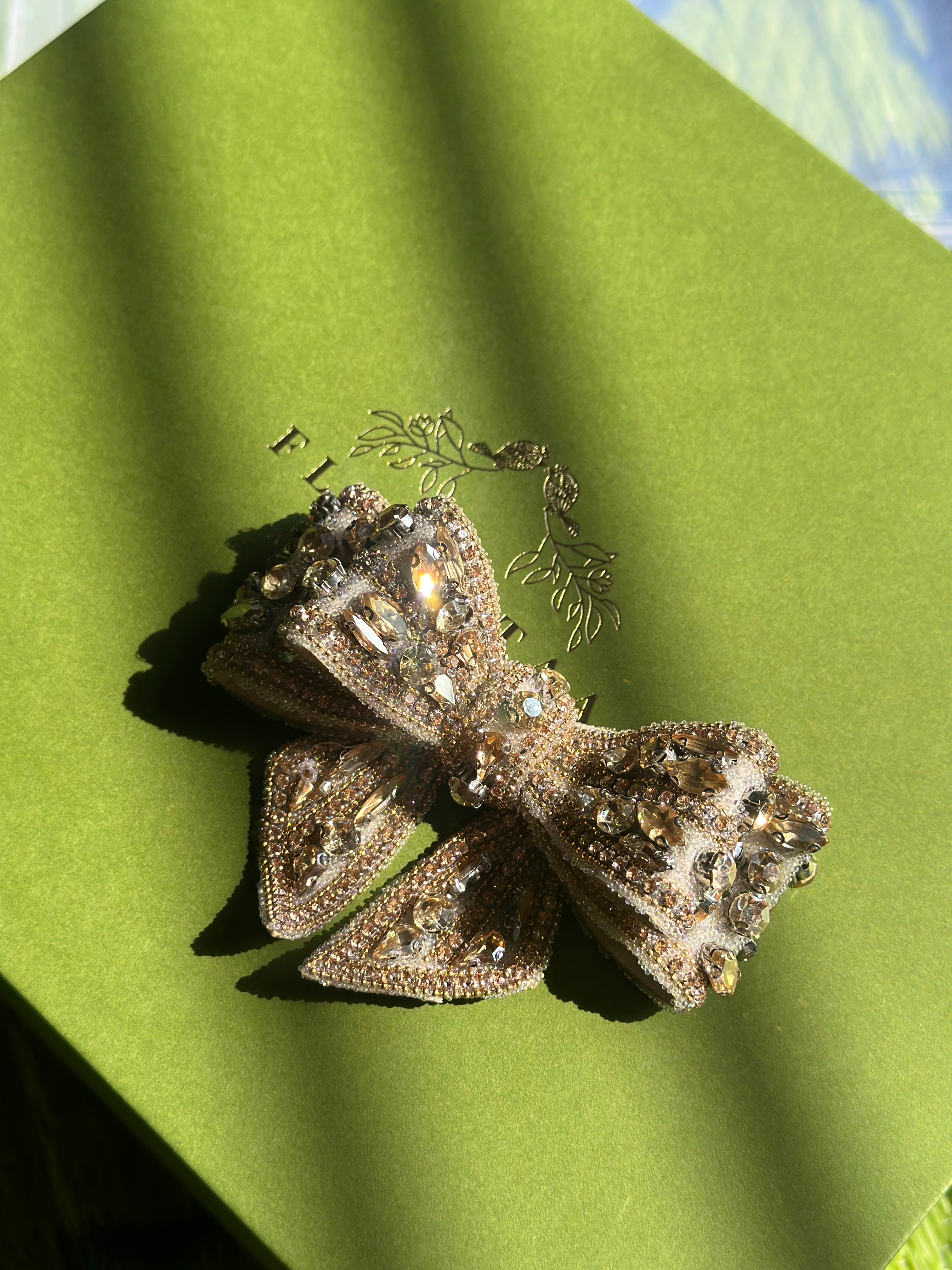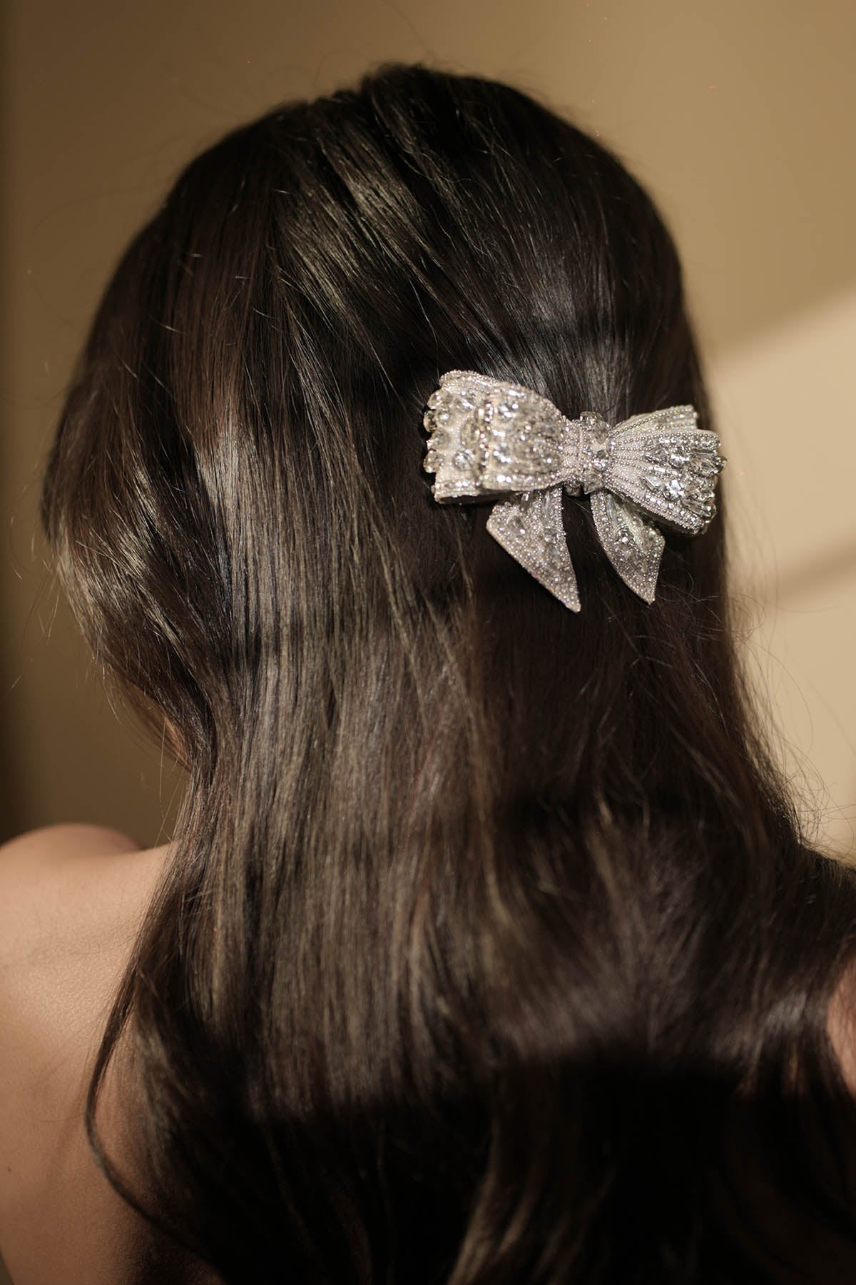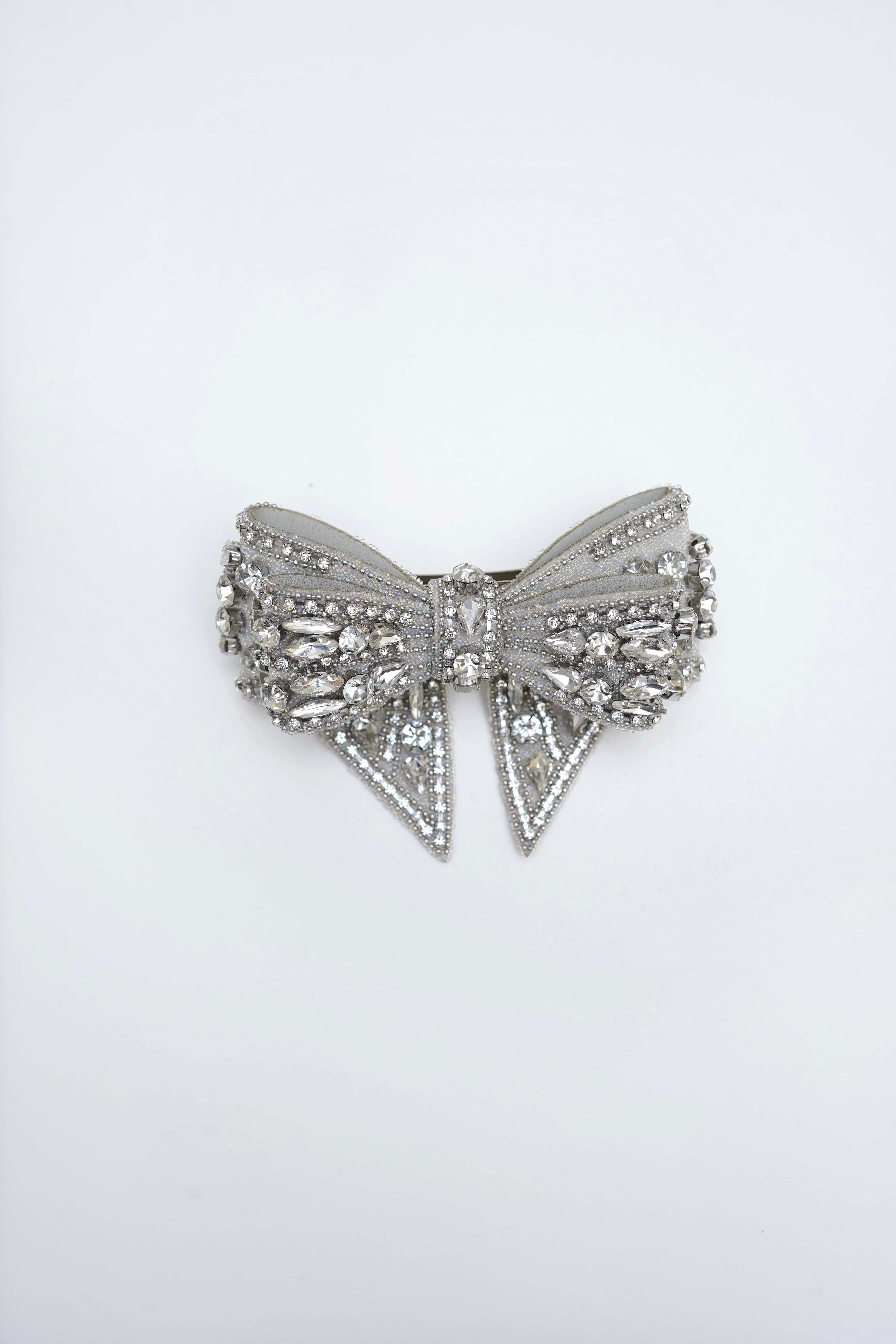 The ultimate accessory for any occasion. Adorned with glittering crystals and a delicate silver bow, this piece exudes elegance and charm. Elevate any outfit with a touch of sparkle and sophistication. Perfect for weddings, parties or everyday wear.