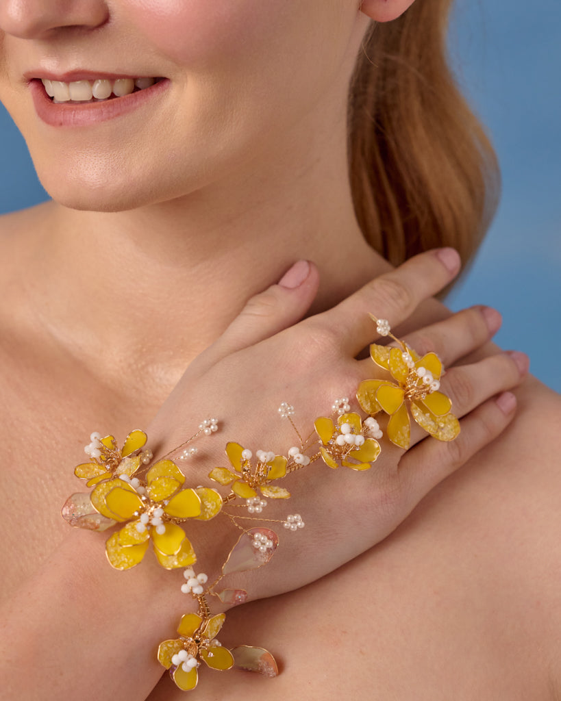 The Adira Hathphool traces the hand with delicate resin blossoms joined by fine, graceful chains. Light and expressive, it moves elegantly with every gesture, adding a romantic charm to bridal rituals and intimate moments. Thoughtfully crafted, the Adira Hathphool brings a refined sense of beauty to even the smallest details.