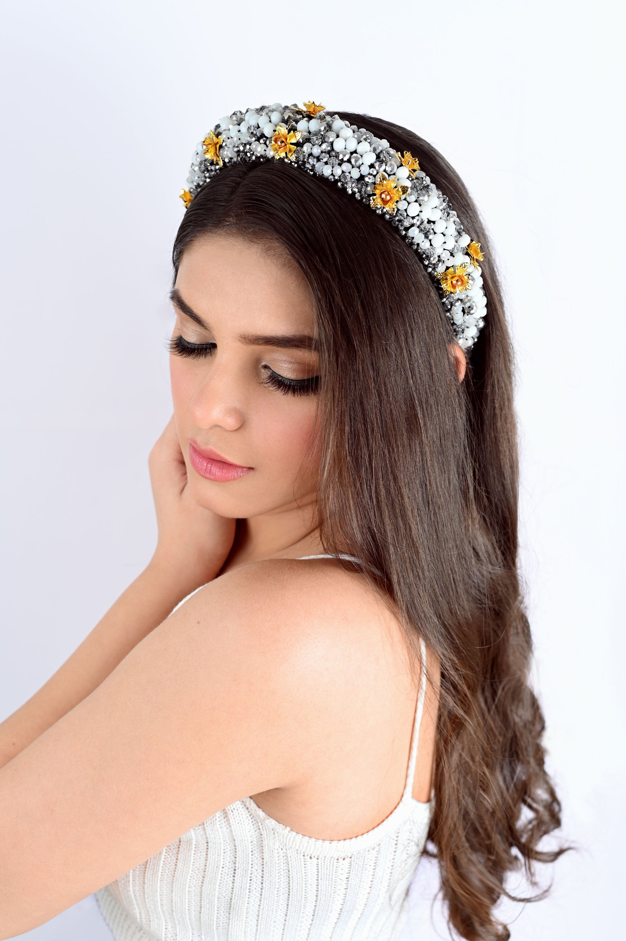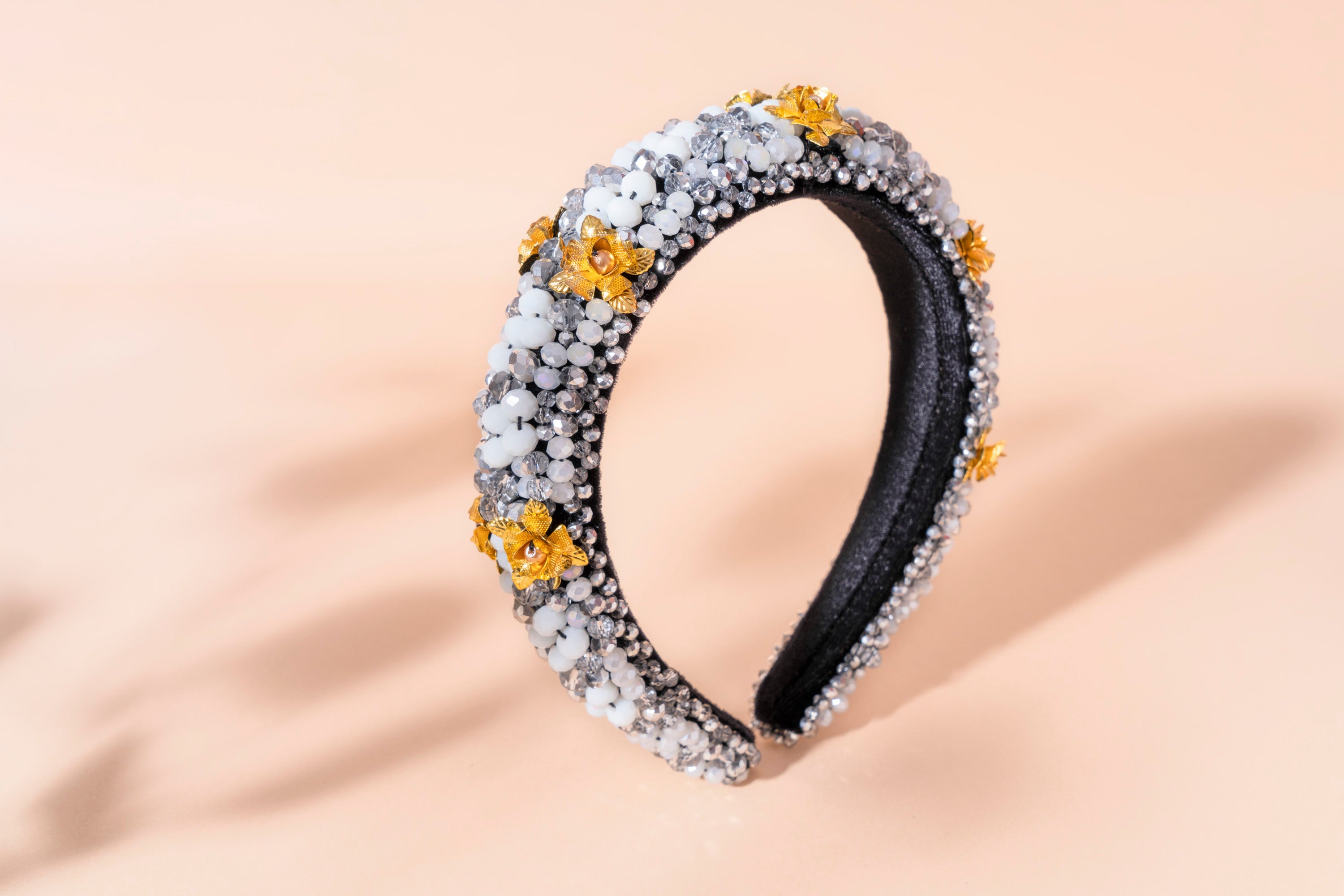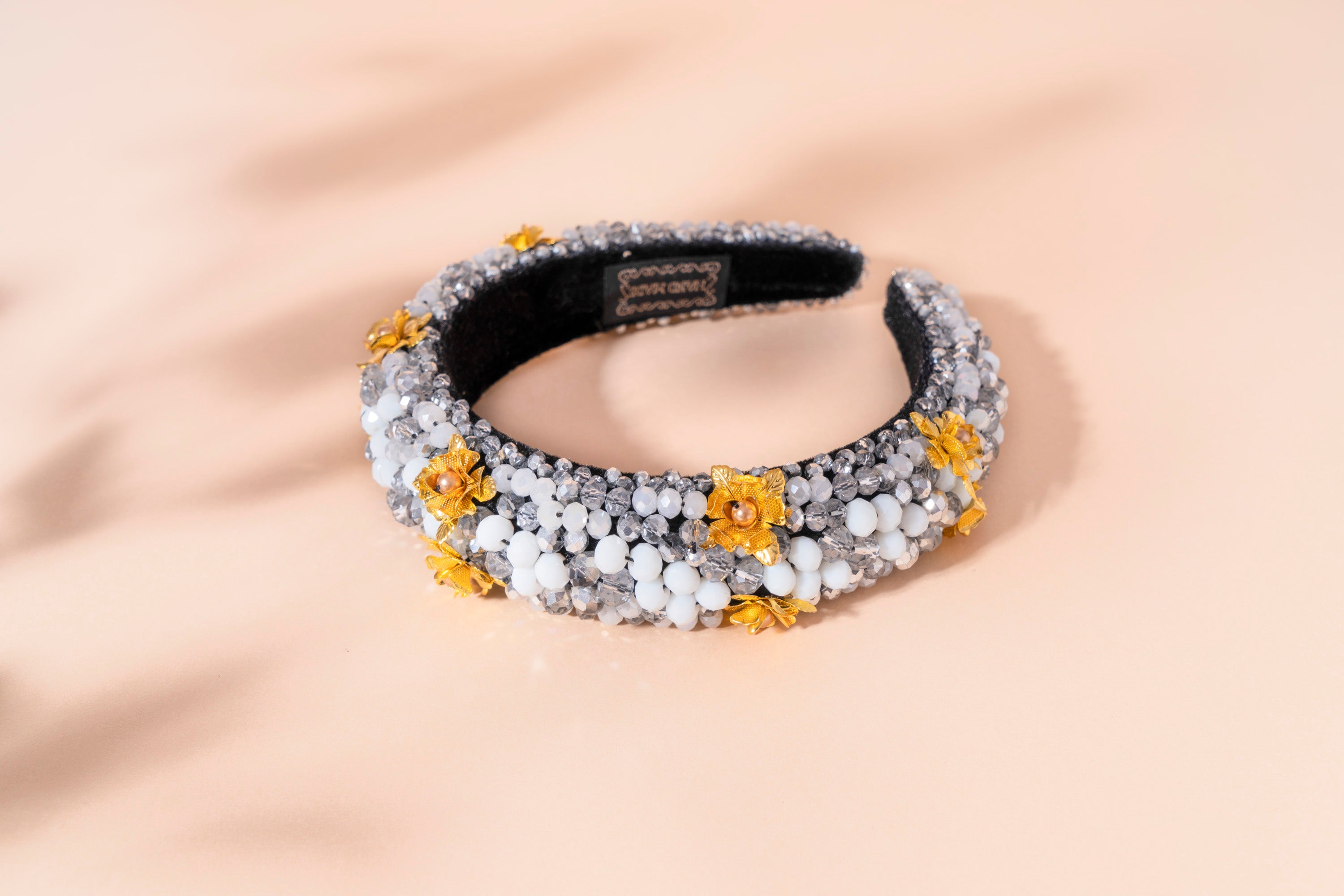 Crystals, metal flowers, velvet plastic base