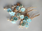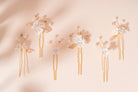 Introducing our exquisitely crafted handmade hairpins, adorned with delicate clay flowers, rhinestone-encrusted leaves, and hand-wired pearl flower charms. This stunning hair accessory is the perfect addition to any bride's or bridesmaid's ensemble, and is ideal for a variety of special occasions, such as weddings, haldi ceremonies, and mehndi events.